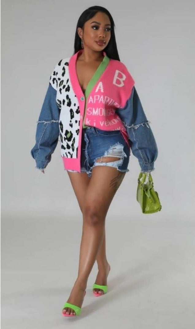 Color Block Cardigan Sweater with denim sleeves. Thick Sweater material. Detailed buttons down front. Onesize fits S-L. This Sweater is 🔥